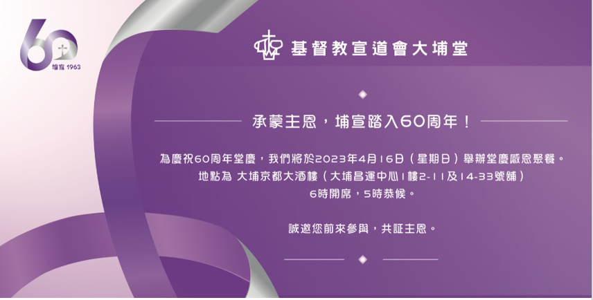2023年是埔宣六十歲生日了! 西方稱為「鑽禧」 ,鑽禧的「鑽」,就是鑽石的意思。鑽石是由「碳」元素所組成的,它是世界上最堅硬、成份最簡單的寶石,是長年在高溫 (攝 氏 900-1300度)和壓力 (45000到 60000大氣壓力 )下而產生的, 60年過去,埔宣家也經歷了不同 時代帶來的溫度與壓力,盼望我們真能成為單純 、堅強 、奪目的生命。